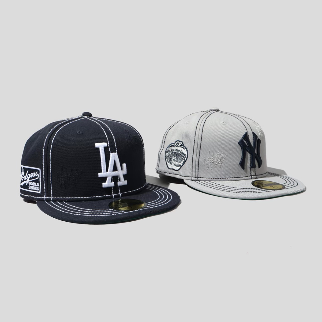 ダメージ加工と濃淡のあるステッチがヴィンテージ感を演出するMFC STORE CUSTOM COLLECTION NEW ERA 59FIFTY。